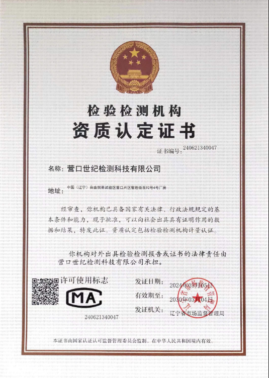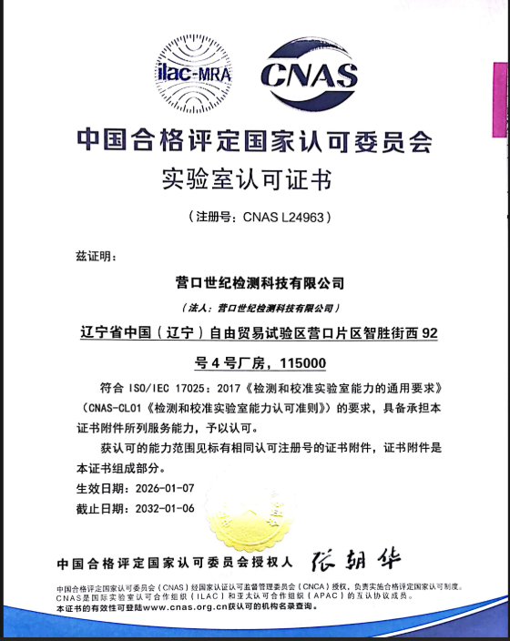 營口世紀檢測科技有限公司獲評實驗室認可證書